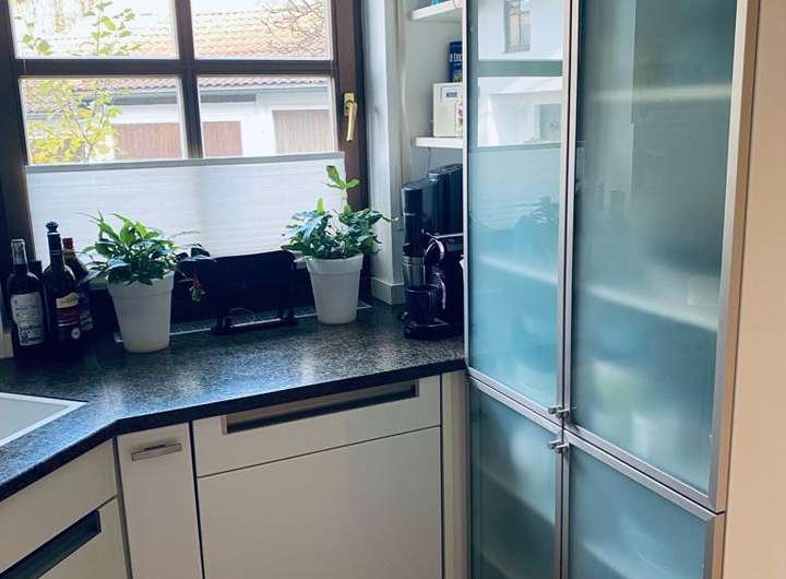 Die hochwertige Schreinerküche wurde maßgefertigt und ist mit einer Steinplatte sowie Marken-Einbaugeräten ausgestattet.