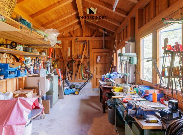 Auf der Gebäuderückseite in Richtung Wald befindet sich ein als "kleine Werkstatt" ausgebautes Gartenhaus.