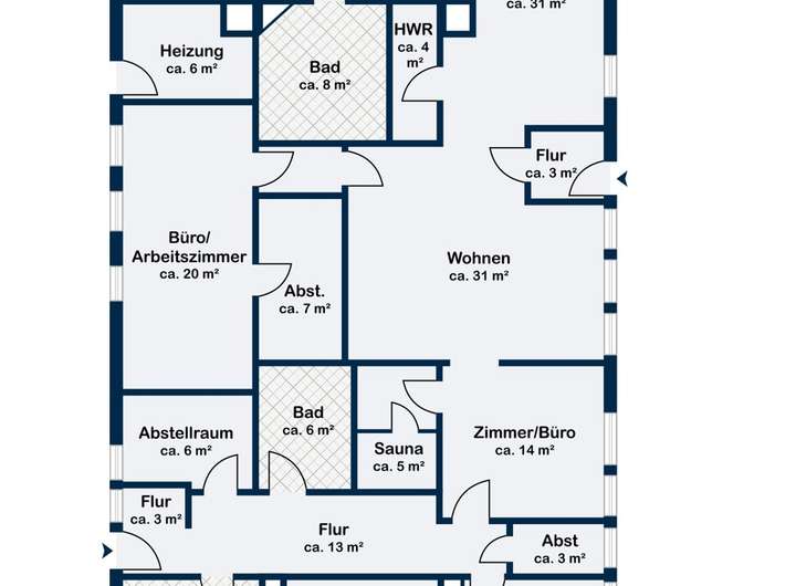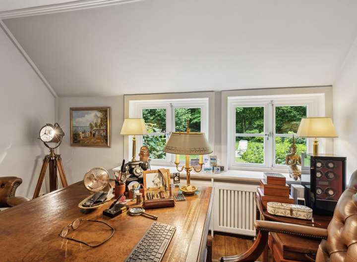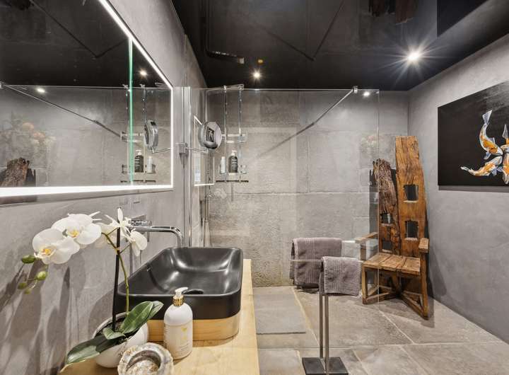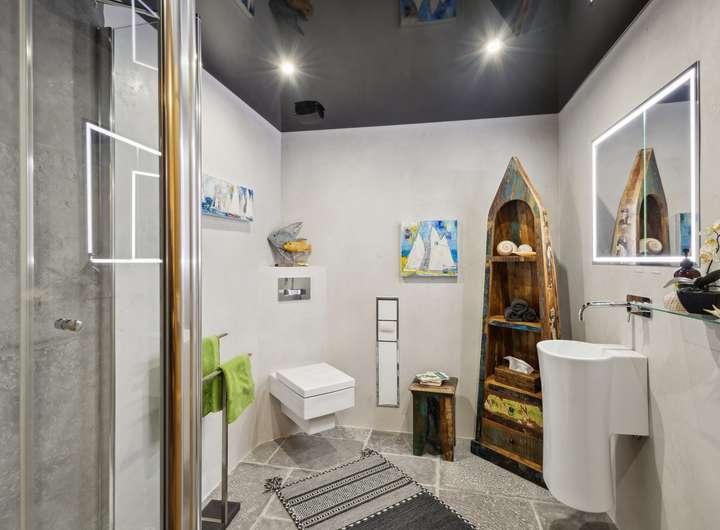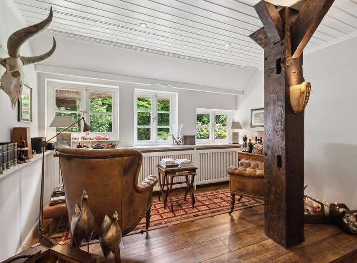 Die Fußböden im Erdgeschoss sind überwiegend mit modernem Eichen-Rustikalboden ausgelegt, während die Nassbereiche selbstverständlich mit hochwertigen Fliesen ausgestattet sind. Das Dachgeschoss präsentiert sich mit Sisalauslegeware oder Teppichboden. Besonders hervorzuheben sind die drei modernen Bäder, die im Jahr 2018 renoviert wurden: Im Erdgeschoss befinden sich zwei Bäder, ein Wannenbad und ein großzügiges Duschbad, das mit Fußbodenheizung ausgestattet ist. Alle drei Bäder verfügen über stilvolle Spanndecken. Im Erdgeschoss finden Sie zudem eine Sauna (feucht und trocken) der Marke Rensch Saunabau, die 2018 eingebaut wurde. Im Dachgeschoss gibt es ein neues Duschbad sowie ein separates WC.