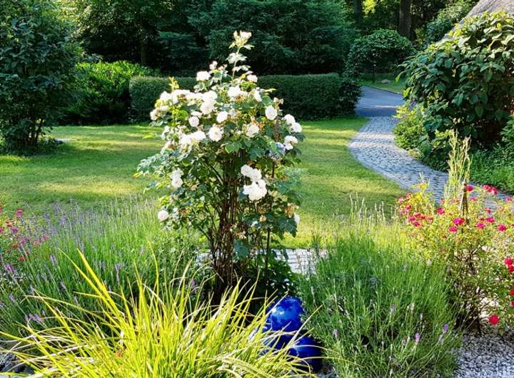 Der Garten bietet großzügige Rasenflächen, die von Rhododendren und farbenfrohen Stauden liebevoll ergänzt werden. Rund um das Haus sorgt eine stilvolle Außenbeleuchtung mit Bewegungsmeldern für eine wunderschöne Illumination am Abend.