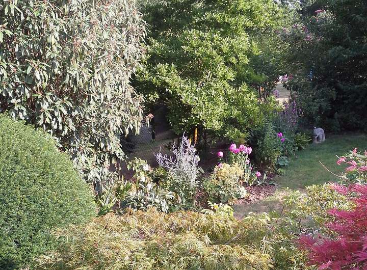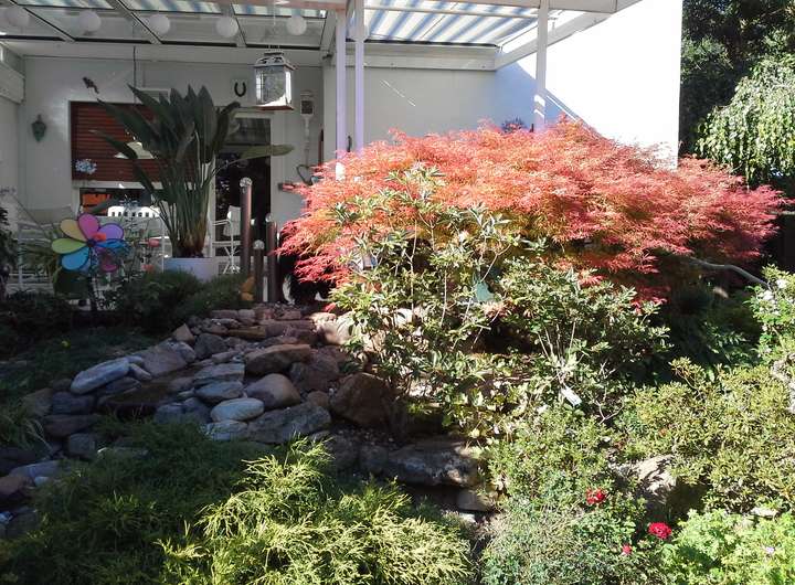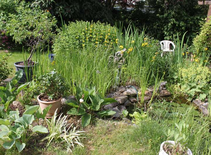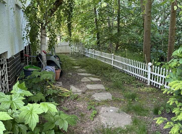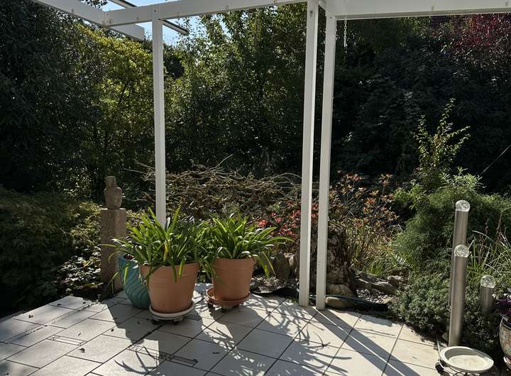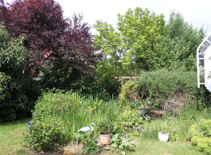 Das außergewöhnlich große Grundstück mit einer Fläche von etwa 655 Quadratmetern ist nicht einsehbar und besticht durch eine idyllische kleine Teichanlage, die dem Garten einen besonderen Charme verleiht.
