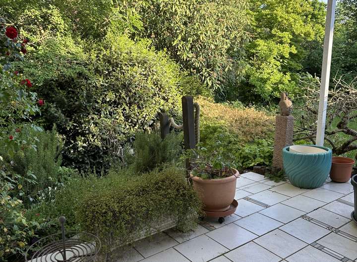 Von der großen Sonnenterrasse aus gelangt man in den eingewachsenen Garten, der das Haus umgibt und viel Privatsphäre bietet.