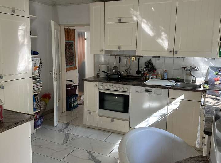Die halboffene Küche ist mit einer modernen Einbauküche ausgestattet, während sich der Essbereich direkt davor befindet – ideal für gemeinsames Kochen und gemütliche Mahlzeiten.