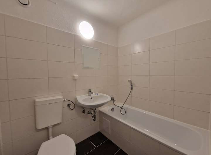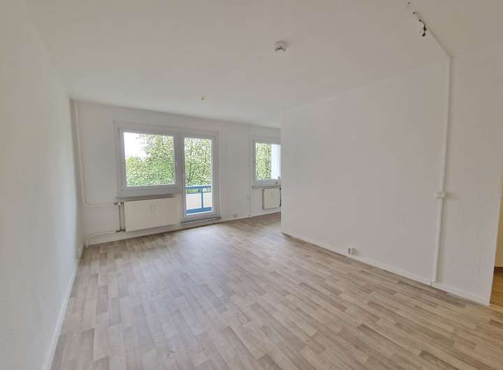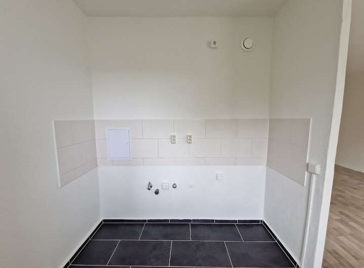 - Wohnbereich mit PVC-Boden und Raufasertapete – schlicht, pflegeleicht, bereit für Ihre Einrichtungsideen