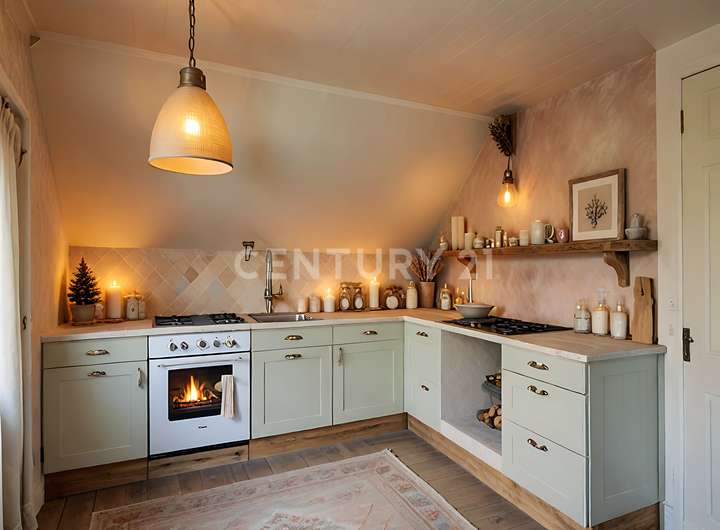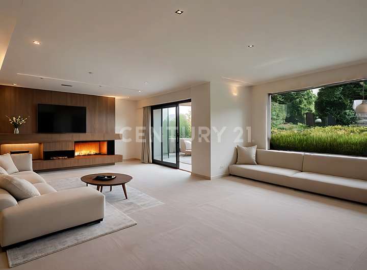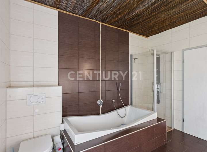 Das Erdgeschoss ist ausgestattet mit einer Fußbodenheizung und verfügt über einen Hausflur, der die beiden Wohnungen voneinander trennt, einen Wohnungsflur, zwei großen, hellen Schlafzimmern, einem stilvollen Badezimmer samt Dusche und Badewanne sowie einer gemütlichen Küche. Außerdem wurde hier eine ursprüngliche Garage clever umfunktioniert und bietet heute zusätzlich ein Badezimmer mit Dusche und ein Schlafzimmer. Zentraler Mittelpunkt ist der Wohn- und Essbereich mit elegantem Kamin sowie direktem Zugang zur überdachten Terrasse, die selbst über einen eigenen Kamin verfügt. Diese besondere Kombination sorgt für maximales Wohlfühlambiente – sowohl drinnen als auch draußen.