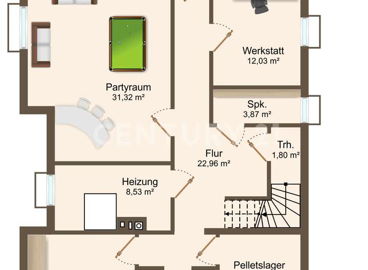 Das gepflegte und zudem trockene Kellergeschoss überzeugt mit einem Waschraum, drei separaten Kellerräumen – inklusive Partyraum mit Theke und Werkstatt – sowie einer Speisekammer und einem Heizungsraum. Hier ist eine moderne Pelletheizung, installiert im Jahr 2011, eingerichtet. Ein separater Pelletlagerraum untermauert die nachhaltige Heizlösung. Zusätzliche Erweiterungen wie eine Solaranlage zur Warmwasserbereitung könnten eine lukrative Investition für die langfristige Kostensenkung darstellen.