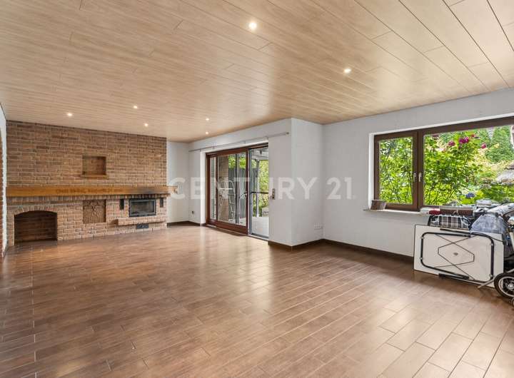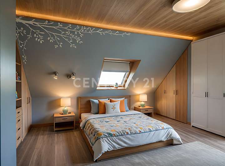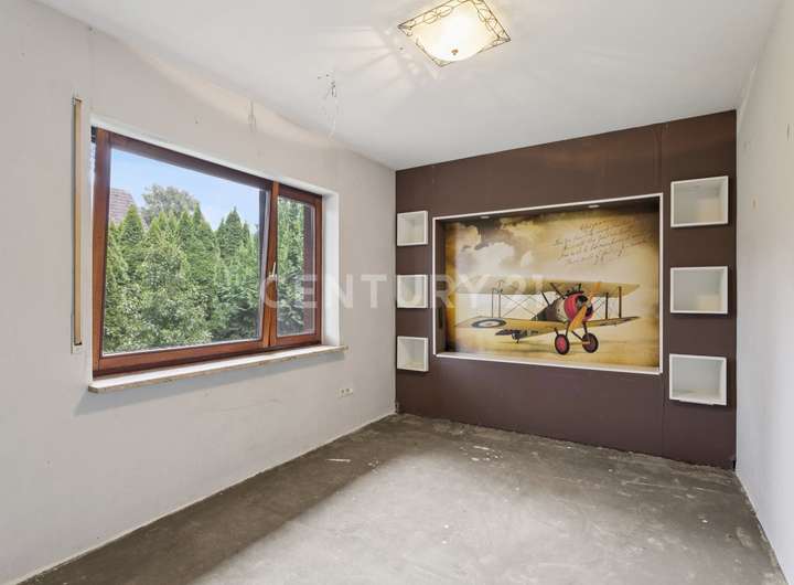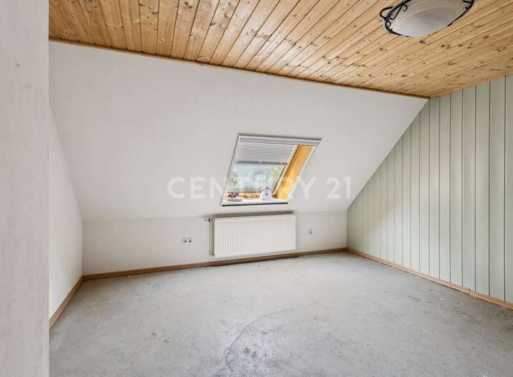 Im Obergeschoss setzt sich das großzügige Raumangebot fort: Ein Flur führt zu einem Wohnzimmer mit Kaminvorbereitung sowie zwei weiteren Schlafzimmern. Eine separate Küche und ein Bad mit Dusche ergänzen das Stockwerk. Der Dachboden offenbart viel Stauraum.