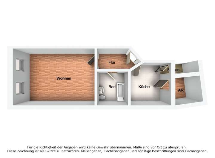 Die Einraumwohnung liegt im zweiten Obergeschoss eines Mehrfamilienhauses in der Nähe des Zentrums der Stadt und kann kurzfristig bezogen werden. Sie verfügt über ein großes, helles Wohnzimmer und eine geflieste Küche, von der man den kleinen Balkon betritt. Das innenliegende Badezimmer verfügt über eine Badewanne, ein WC und einen Waschtisch. Ein kleiner Abstellraum grenzt an die Küche.