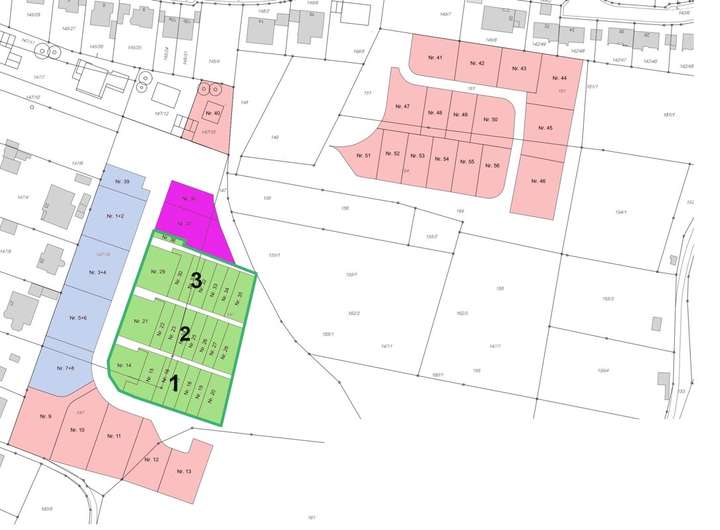 Insgesamt 5.354,64 m² Grundstücksfläche können für die Bebauung von Reihenhäusern erworben werden. Teilbar sind diese in drei einzelne Parzellen ab 1.694,74 m². Die Erschließung ist bereits abgeschlossen.