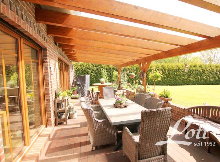 Die überdachte Terrasse befindet sich in optimaler Sonnenausrichtung und lädt zum Verweilen ein - ideal für Grillabende oder Familienfeiern.