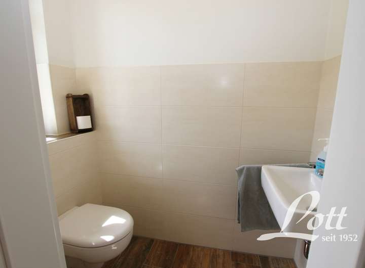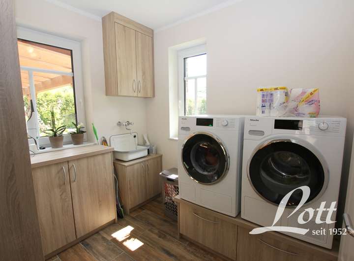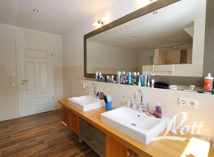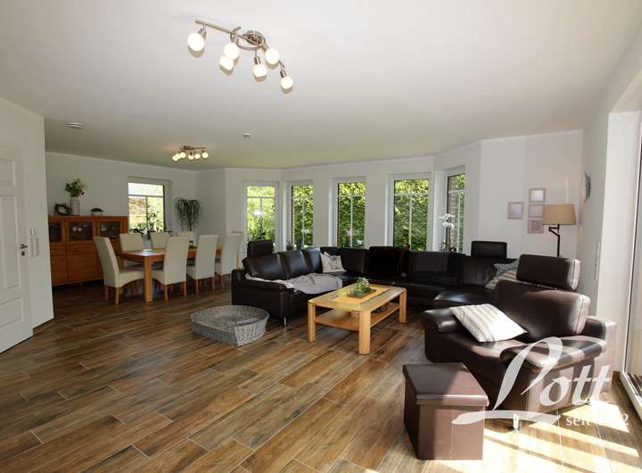 Sehr großzügiger Wohn- und Essbereich von ca. 53 m², Küche mit Einbauküche und weiterem Essbereich, Büro, lichtdurchflutete Eingangsdiele mit Gäste-WC, Hauswirtschaftsraum mit weiterem Gäste-WC und Nebeneingang sowie Zugang zur Garage.