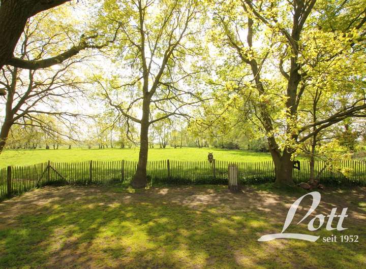 Das ca. 2.830 m² große Grundstück verfügt über einen regelmäßigen Zuschnitt und ist in seinen Grenzen mit hochgewachsenen Hecken bzw. Zaunanlagen umstanden (Hundehaltung möglich). Rückwärtig grenzt der Garten an ein Wiesen und Felder und bietet weite Blicke in die grüne Natur.