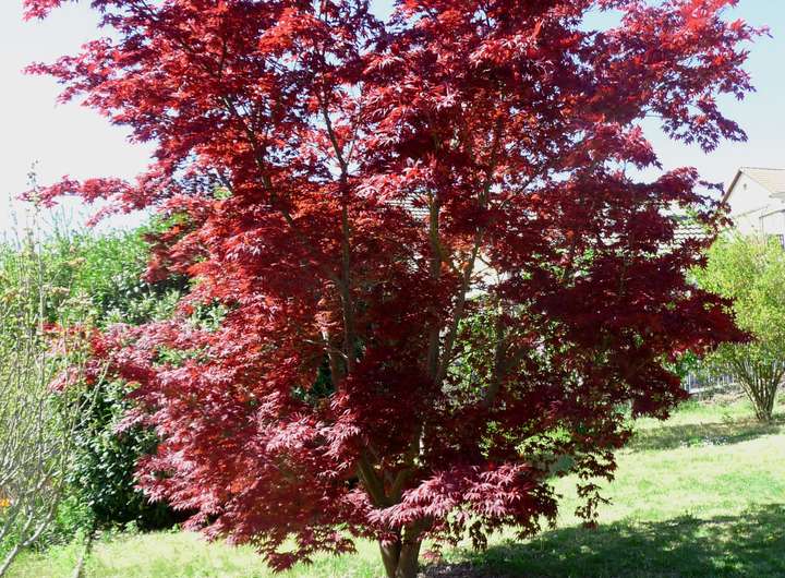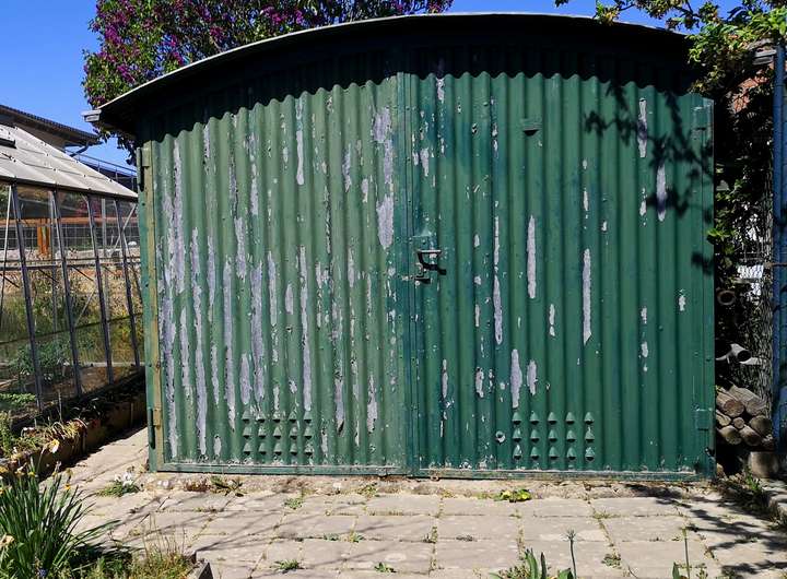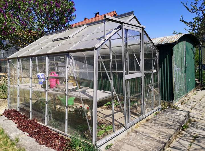 Ein Gewächshaus sowie ein fensterloser Schuppen zur Unterbringung von Gartengeräten ist auf dem Grundstück vorhanden. Ein Bereich für Beete ist im oberen Bereich abgeteilt. Der Rest des Grundstücks ist mit Wiese, Bäumen und Sträuchern bepflanzt.