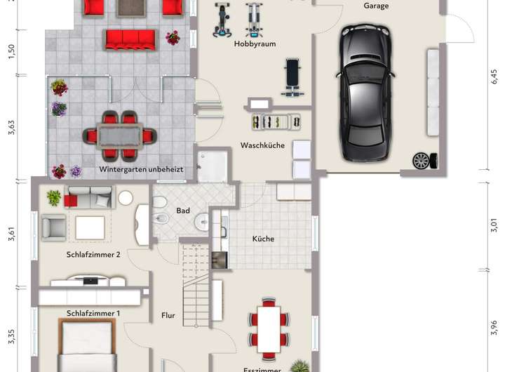EG: gr. Küche mit Esszimmer, unbeheizter Wintergarten, 2 weitere Zimmer, Bad, HWR, Hobbyraum (mit Zugang zur Garage), Flur
