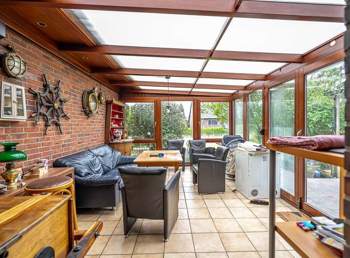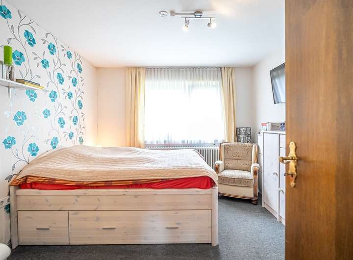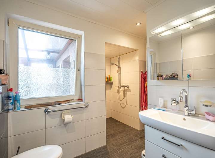Im Erdgeschoss befinden sich zurzeit zwei Schlafzimmer, da der Hobbyraum derzeit als Wohnzimmer genutzt wird. Weitere Räumlichkeiten sind der unbeheizte Wintergarten, mit direktem Zugang zur Terrasse, dem großzügigen Küchen- und Esszimmerbereich sowie das 2011 sanierte Badezimmer. Von der Küche, mit integrierter Einbauküche, gelangt man direkt in die praktische Waschküche, hierüber kann man durch den "Hobbyraum" weiter in die Garage gelangen.