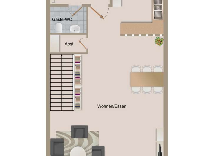 Bereits beim Betreten des Hauses empfängt Sie ein großzügiger Flur mit genügend Platz für eine Garderobe. Hier befindet sich auch das praktische Gäste-WC – ideal für Besucher und den täglichen Komfort.