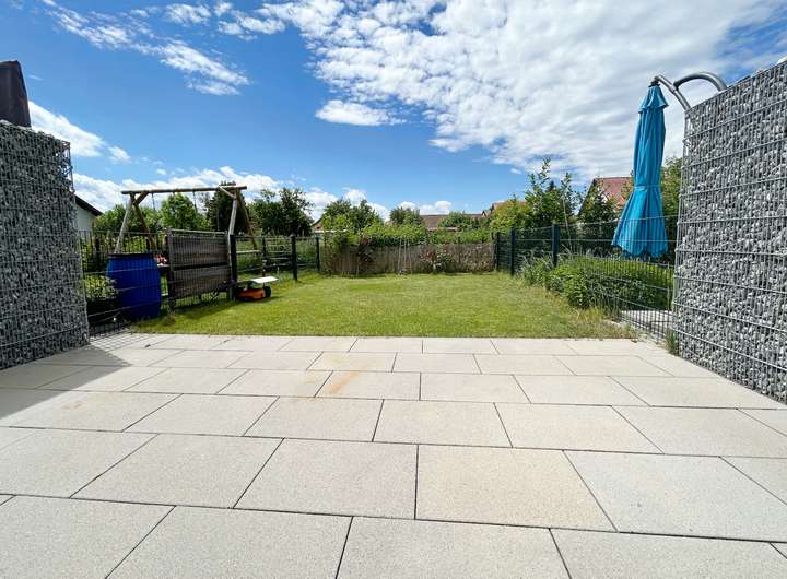 Die sonnige Terrasse mit kleinem Gartenbereich. Ob gemütliche Grillabende, entspannte Sonnenstunden oder ein ruhiger Ausklang des Tages – hier steht Ihnen jede Möglichkeit offen.