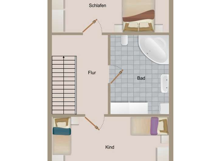Über die Treppe erreichen Sie das erste Obergeschoss, das ganz im Zeichen von Privatsphäre steht. Zwei gut geschnittene Schlafzimmer sowie das großzügige Badezimmer mit Badewanne und Dusche schaffen hier eine ideale Rückzugsoase für die ganze Familie.