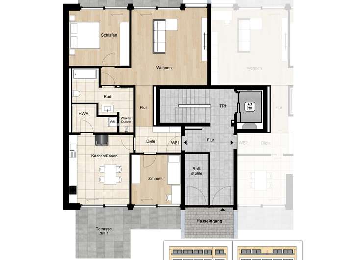 Sämtliche Etagen sind mit einem großen Personenaufzug anfahrbar.