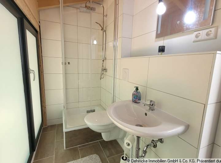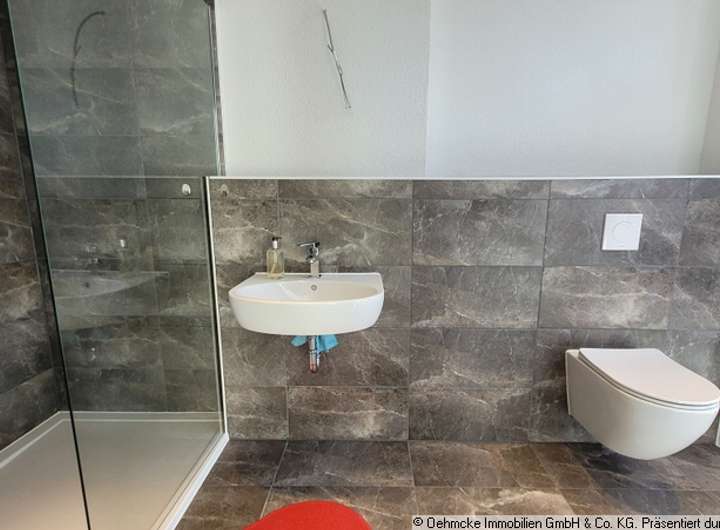 Die hochwertige Ausstattung setzt sich auch im modernen Badezimmer fort: Klare Linien und helle Fliesen unterstreichen das durchdachte Design.