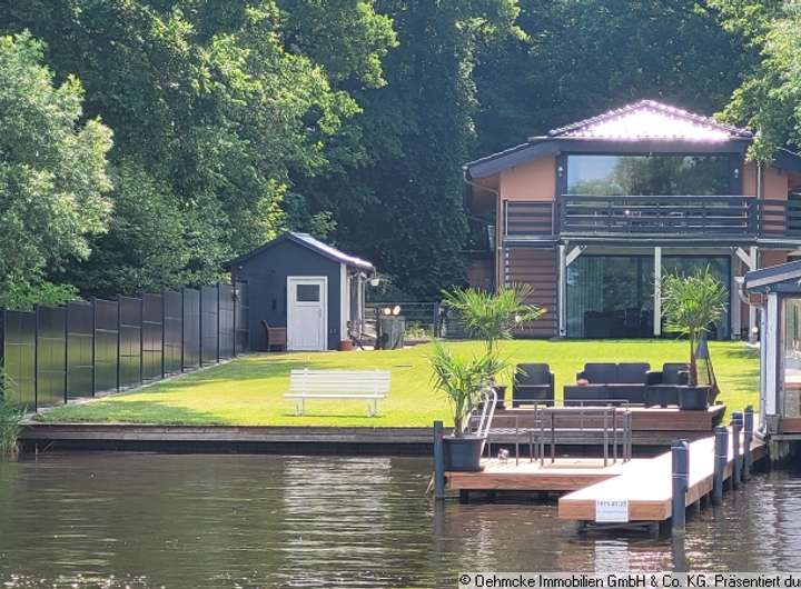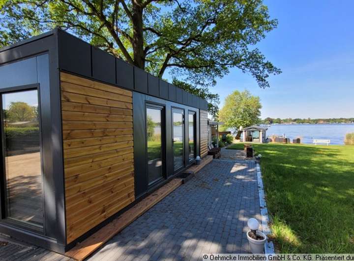 Die aufstehenden Baulichkeiten im Außenbereich bieten ebenfalls vielfältige Nutzungsmöglichkeiten. Im vorderen Teil des Grundstückes, zur Wasserseite hin gelegen, befinden sich noch ein Gästebungalow mit Wohn- und Schlafbereich sowie Küchenzeile; ein Mehrzweckgebäude mit einem Duschbad und einer kleinen Küche sowie das Bootshaus mit einem Zimmer direkt am Wasser.