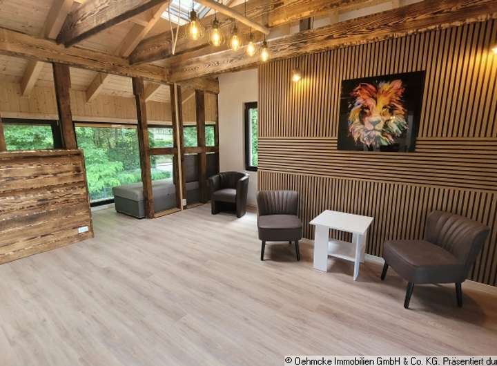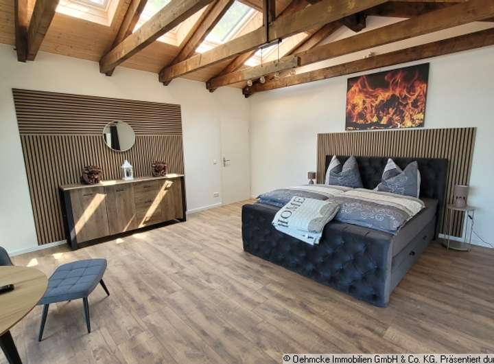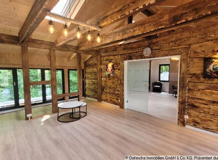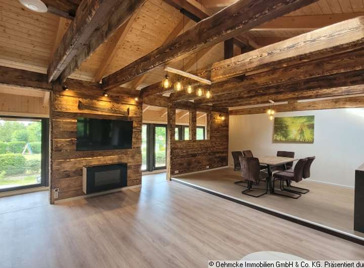 Zeitgemäßer Wohnkomfort trifft auf urigen Charme. Der großzügige gestaltete Wohn- und Essbereich besticht durch offenliegende, gebürstete Holzbalken, warme Naturtöne und ein stilvolles Lichtkonzept, dass die rustikale Atmosphäre perfekt in Szene setzt.