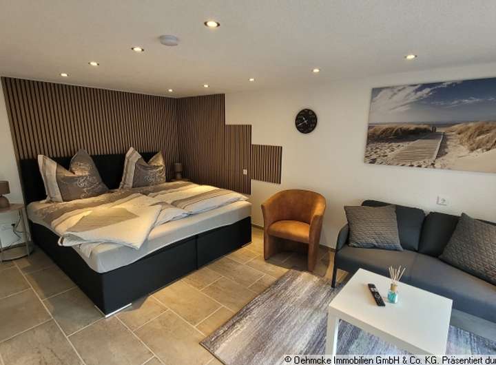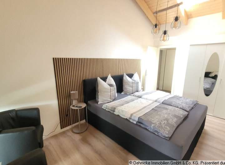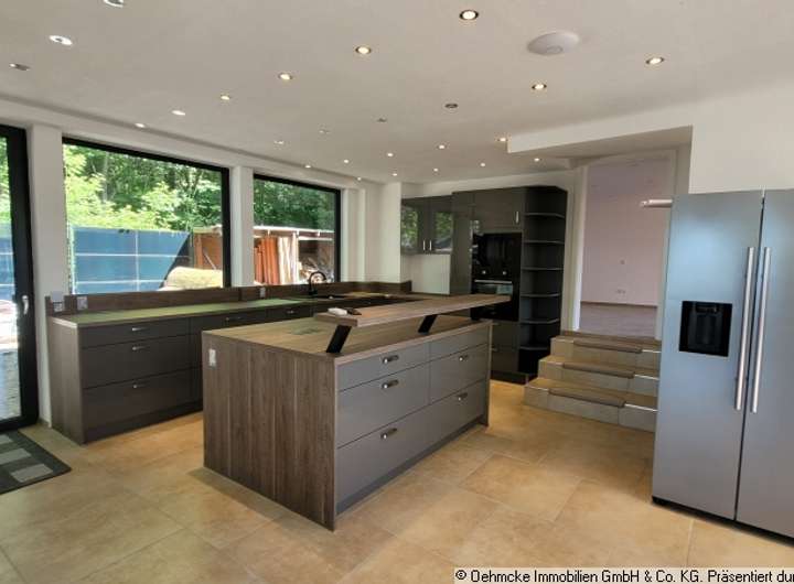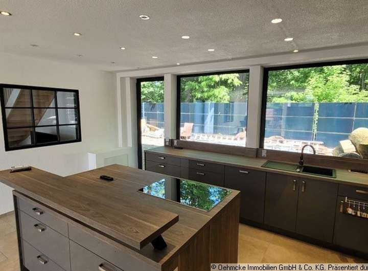 Exklusiv ausgestattet einschließlich aller Elektrogeräte präsentiert sich die neu eingebaute Küche; eine großzügige Mittelinsel mit Induktionsherd trennt diese räumlich zur Wohndiele hin.