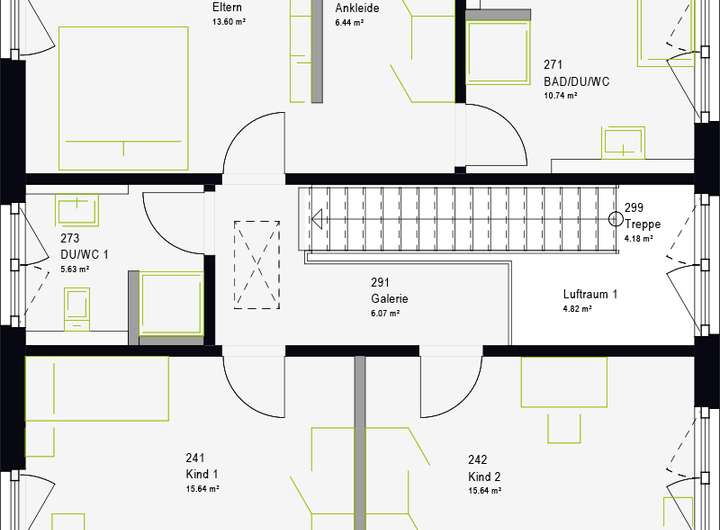 Unsere projektierten Ausbauhäuser sind von außen fertig verputzt, mit Fenstern, Eingangstür, Dacheindeckung und Dachrinnen. Die Heizungsanlage mit Fußbodenheizung, mit kompletter Elektroinstallation, sowie der Buche-Holztreppe EG/DG sind inkl. Montage enthalten.