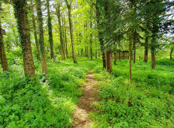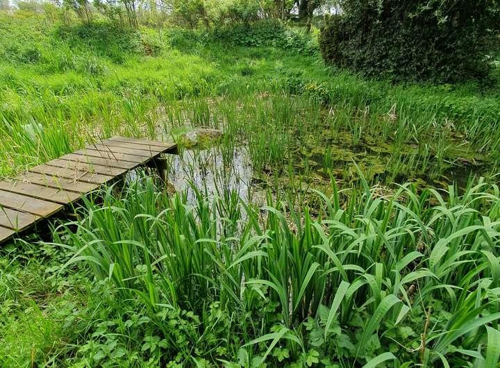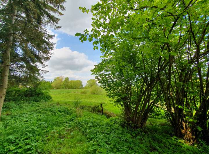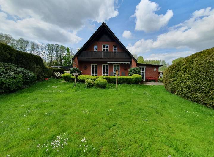 Das große Grundstück hat an der Terrasse einen gepflegten Garten mir Rasenflächen und zwei Gartenhäusern. dahinter liegt ein kleines Waldgrundstück. Am Ende des Grundstücks ist ein kleiner Teich mit Steg angelegt. Das Grundstück liegt am Ufer eines kleinen Bachlaufes, direkt an einer großen Koppel, so dass ein weiter ungestörter Blick möglich ist.