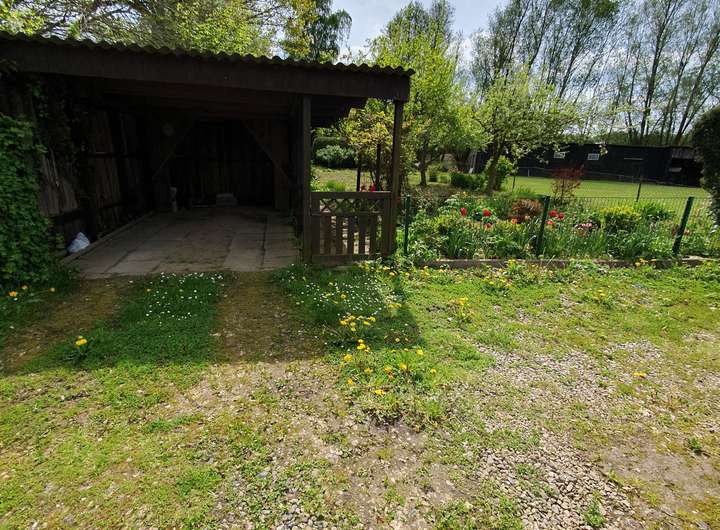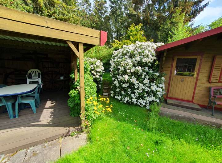 Auf der anderen Straßenseite ist ein weiteres Grundstück, das mit gemietet werden kann. Hier gibt es einen Carport mit Schuppen uns einen großen Gemüsegarten bis zu einem kleinen Bachlauf.