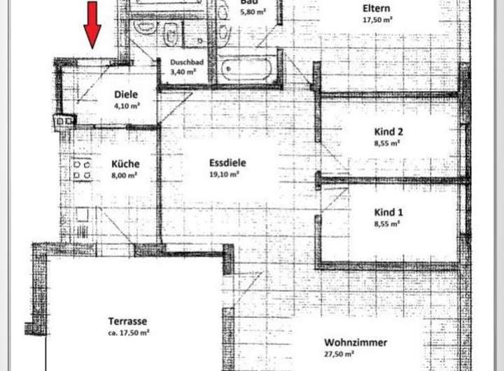Nach Betreten der Wohnung befinden Sie sich in der Eingangsdiele (ca. 4,1 m²). Von hier gelangen Sie in die eingerichtete Küche (ca. 8,0 m²), in das innenliegende Gästebad mit Dusche (ca. 3,4 m²), sowie in den sehr großzügigen Wohn- und Essbereich (ca. 46,6 m²) der Wohnung. Vom Essbereich aus erreichen Sie dann das große Elternschlafzimmer (ca. 17,5 m²) mit einem eigenem Tageslicht-Badezimmer en Suite (ca. 5,8 m²), als auch die beiden Kindezimmer mit jeweils ca. 8,5 m². Die Wohnung ist mit einem neuen Einbauschrank und einer Einbauküche ausgestattet.