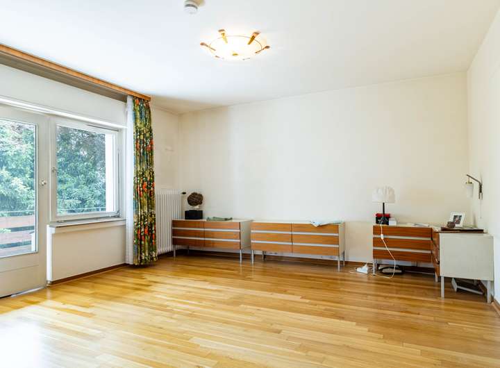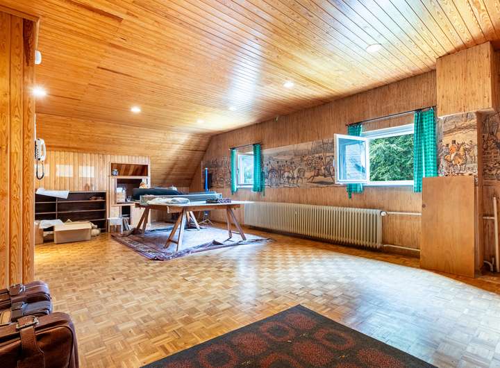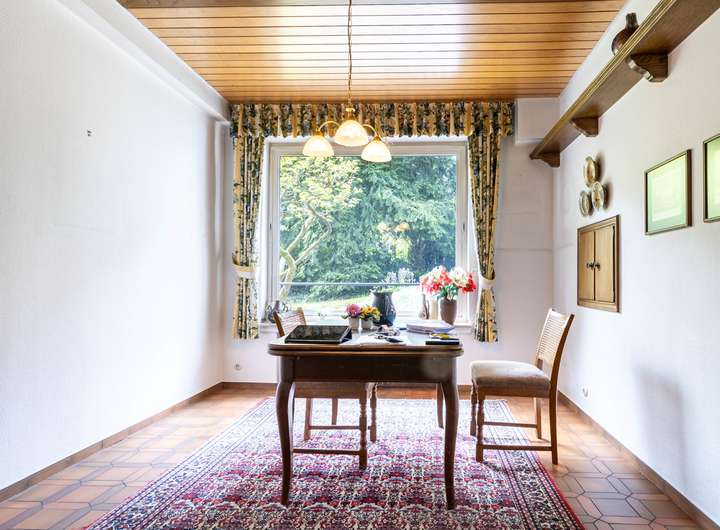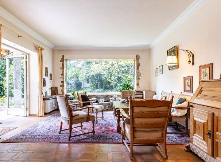 Ein großzügiger Anbau aus dem Jahr 1960 ergänzt das Hauptgebäude um moderne Wohnräume. Großzügige Fensterflächen lassen viel Tageslicht ins Innere und eröffnen einen traumhaften Blick in den weitläufigen Garten. So entsteht eine harmonische Verbindung von Wohnkomfort und Naturerlebnis.