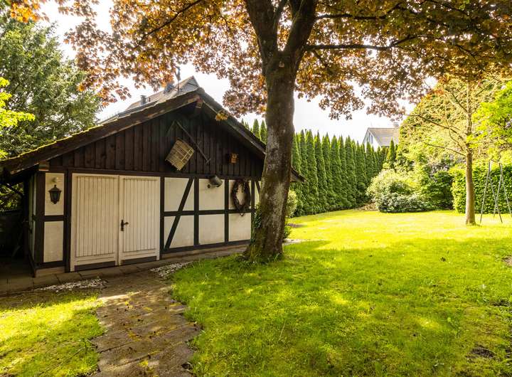 Abgerundet wird das Ensemble durch eine Garage mit direktem Zugang zum parkähnlichen Garten, die praktische Unterstellmöglichkeiten für Fahrzeuge und Equipment bietet.