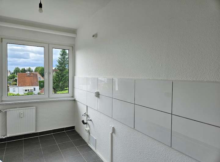 - Anthrazite Boden- und weiße Wandfliesen in der Küche