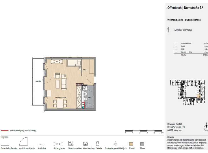 Die schöne 1-Zimmer-Wohnung befindet sich im 4. Obergeschoss eines gepflegten Mehrfamilienhauses.