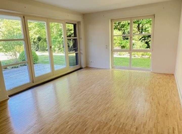 Das geräumige Wohnzimmer mit direktem Zugang zur sonnigen Südterrasse und zum Gartenanteil schafft eine helle und freundliche Atmosphäre. Die zweite, nach Westen ausgerichtete Terrasse lädt zu gemütlichen Abendstunden im Freien ein.