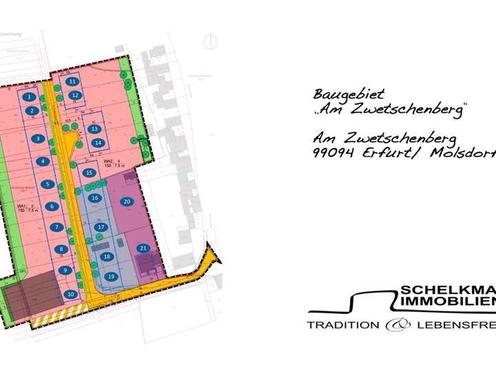Wir bieten Ihnen hier ein wunderbares Liebhabergrundstück zum Kauf an: das 755 m² große Baugrundstück befindet sich romantisch in leichter Hanglage im grünen Stadtteil Molsdorf, im westlichen Teil der Landeshauptstadt Erfurt gelegen. Das Grundstück befindet sich an der Stirnseite im neu entstehenden, allgemeinen Wohngebiet WA 1 westlich der Erschließungsstraße "Am Zwetschenberg" und blickt rückseitig über Felder und Wiesen.