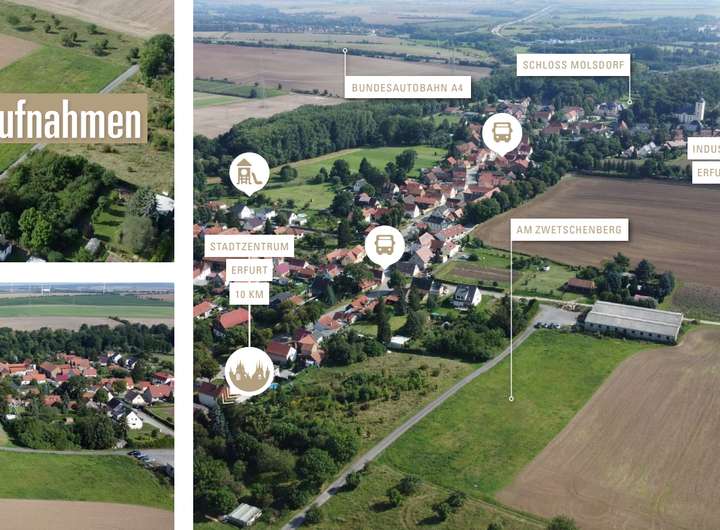 Der Stadtteil Molsdorf liegt im Südwesten der Stadt. Das eingemeindete Dorf ist eines der beliebtesten Erfurter Wohnquartiere. Einerseits ländlich umgeben von Rad- und Wanderwegen, so liegt es doch verkehrsgünstig am Autobahnkreuz und somit auch in der Nähe des größten Thüringer Gewerbeparks- Erfurter Kreuz. Die Erfurter Innenstadt ist mit Bus und Auto gut zu erreichen und auch im kulturverwöhnten Arnstadt ist man schnell. Keine 5 min entfernt liegt Ichtershausen und damit Schule, Kindergarten, Einkaufsmöglichkeiten und Freibad.