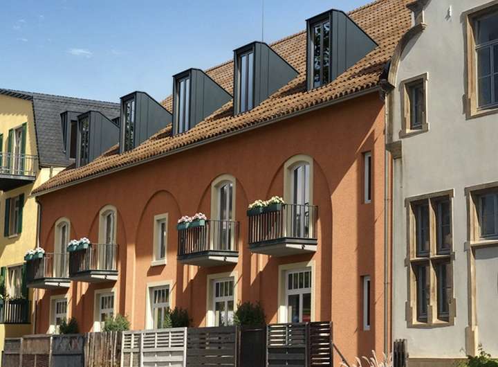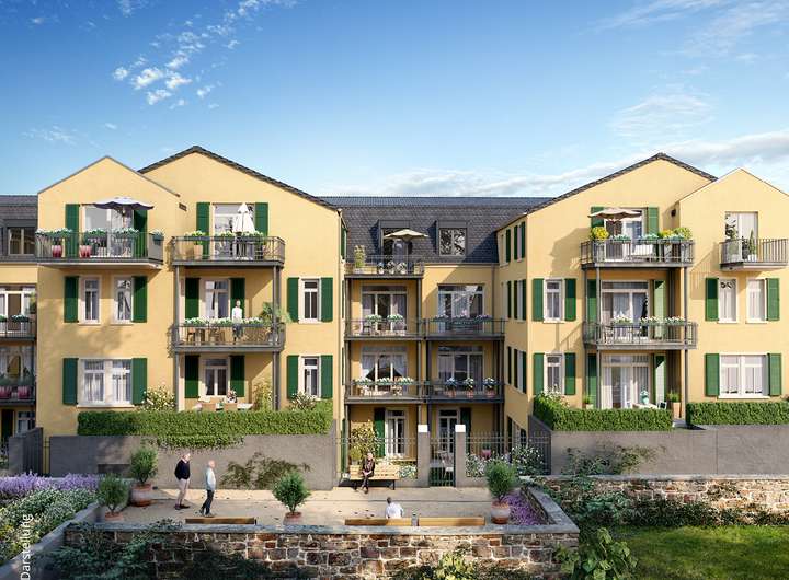 Etwas von der Straße zurückgenommen entsteht das Domizil, ein langgestreckter Wohnflügel, dessen Architektur von der historischen Bebauung inspiriert ist und einen Altbau integriert. Hier bieten 53 Eigentumswohnungen und attraktive Gemeinschaftsflächen sowie Räumlichkeiten für Betreuungs- und Pflegedienste hochwertigen Lebensraum für ältere Menschen, die Unabhängigkeit und Gemeinschaft gleichermaßen schätzen.