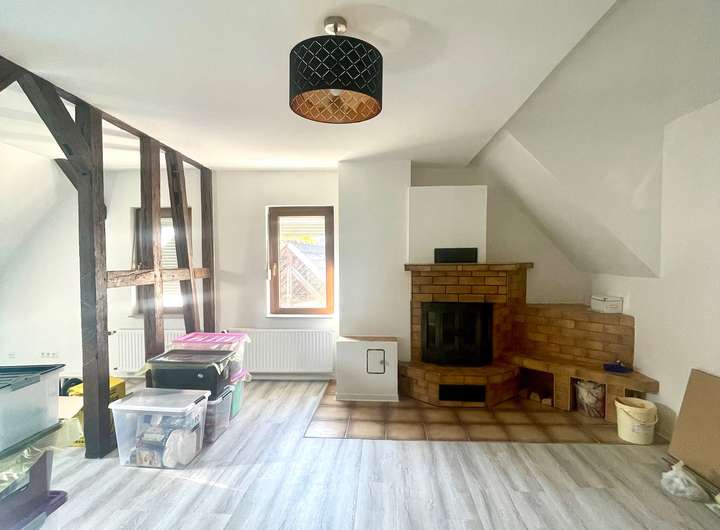 Das Haus empfängt Sie mit einem großzügigen Eingangsbereich, der durch eine Tür von den übrigen Räumen getrennt ist. Da das Haus aktuell in zwei Wohneinheiten genutzt wird, befinden sich sowohl im EG als auch im OG Küchenanschlüsse, die sich auch einfach wieder umfunktionieren lassen. Die Gestaltung im EG lässt sich beliebig gestalten, beispielsweise mit einem Wohnzimmer und zusätzlichem Gästezimmer. Im OG empfangen Sie 3 großzügig geschnittene Zimmer mit Altbaucharme durch die zum Teil offenen liegenden Holzbalken und einem Kaminofen.