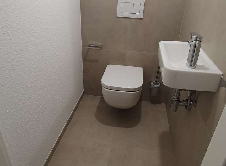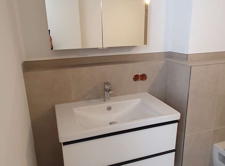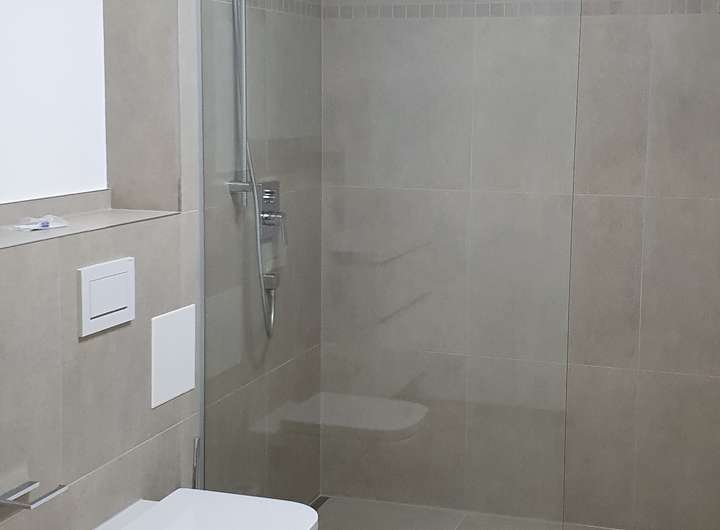 Das Bad ist mit bodenebener Dusche, einem Waschtisch mit Unterschrank, sowie mit Bad- Spiegelschrank ausgestattet. Die Räume verfügen alle über einen Netzwerkanschluss.