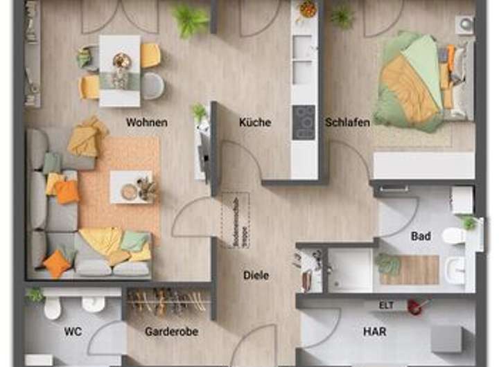 Auf rund 78 Quadratmetern finden Sie dank cleverer Planung ausreichend Platz für die ganze Familie. In den hellen, großzügig geschnittenen Zimmern wohnen Sie auf einer Ebene mit der Natur. Ob Wohnzimmer, Küche oder Schlafzimmer – überall sind Sie nur einen Schritt von Ihrem Garten entfernt.