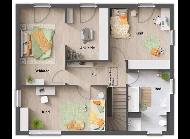 Auch das Obergeschoss zeigt sich im gradlinigen Baustil des Hauses. Hier finden Sie drei Zimmer, die Sie nach Ihren Vorstellungen als Schlaf-, Kinder- oder Gästezimmer nutzen können. Große Fenster lassen auch hier viel Tageslicht hineinströmen. Die Ankleide im Schlafzimmer bietet viel Stauraum.