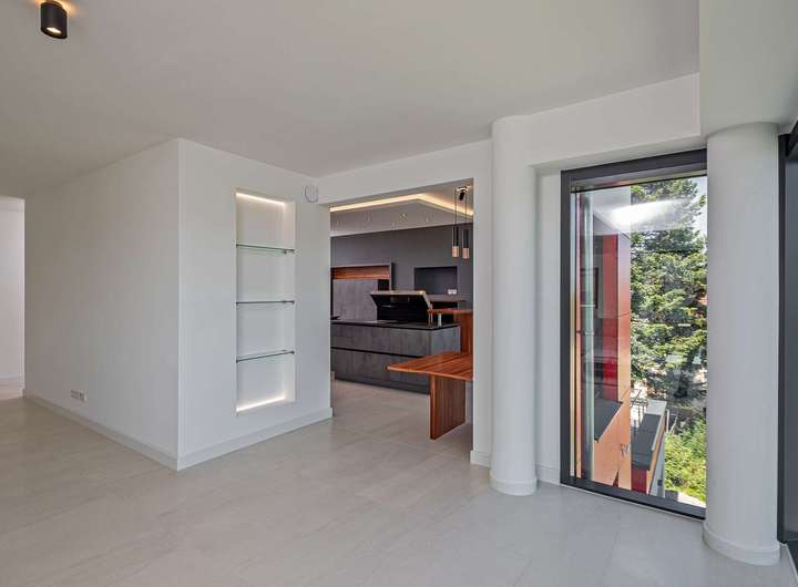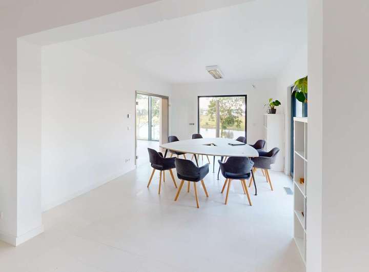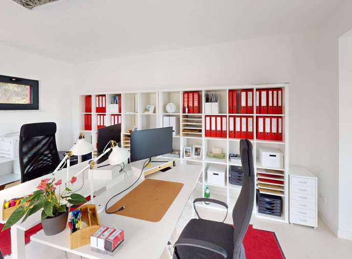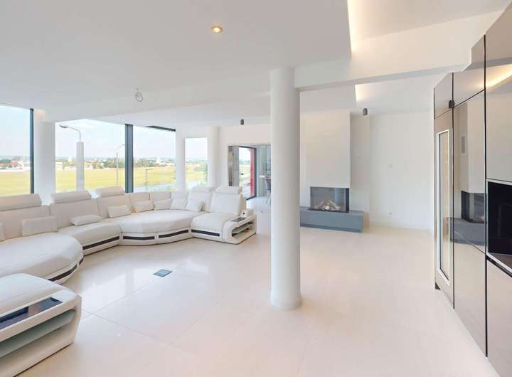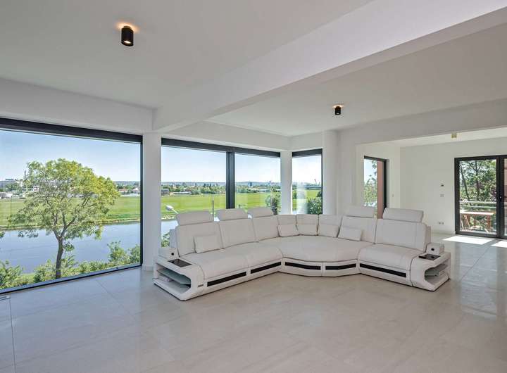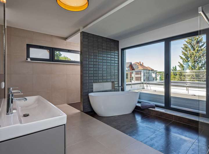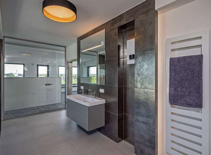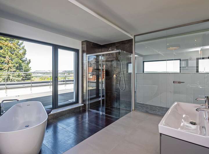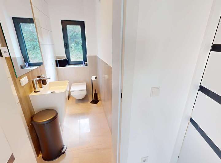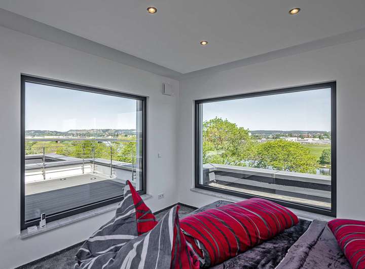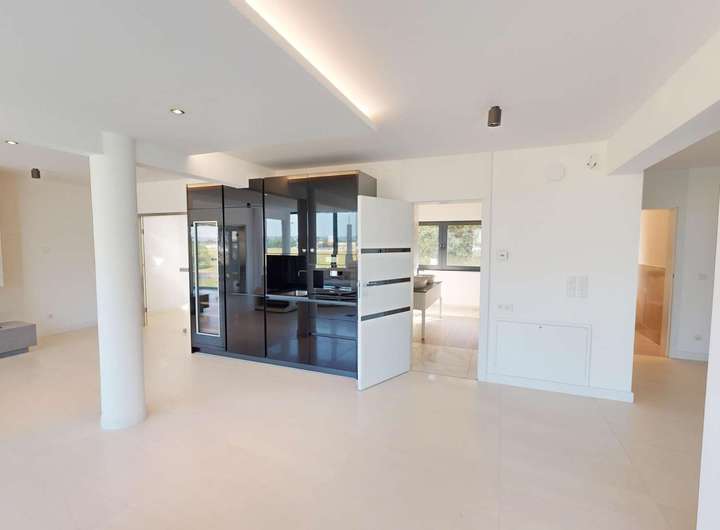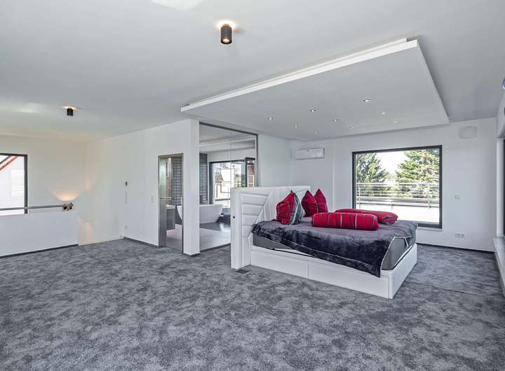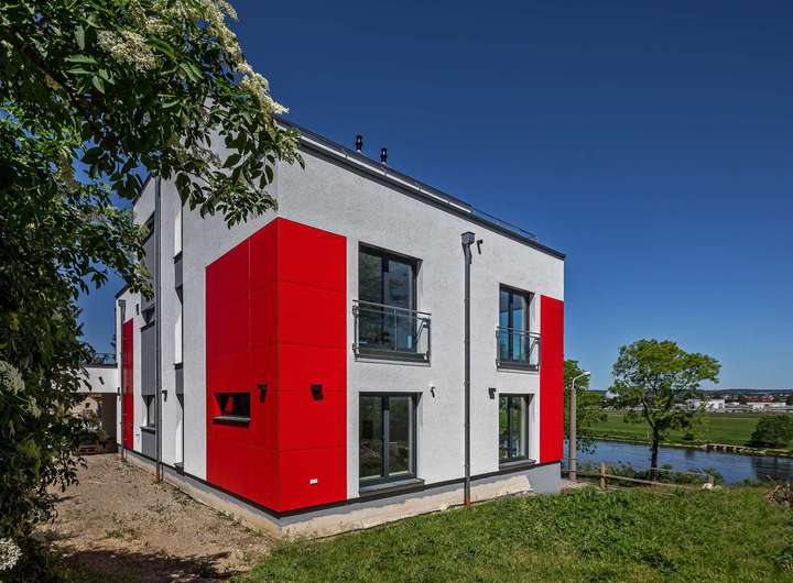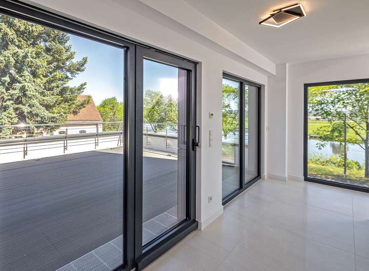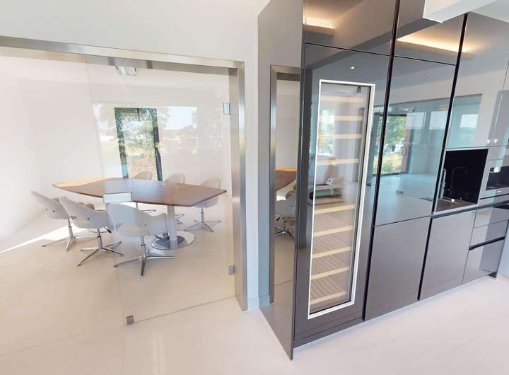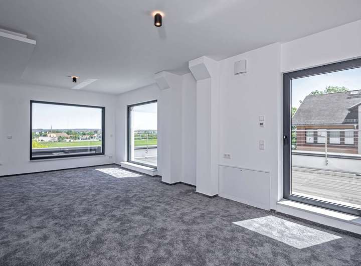 Das Gebäude verfügt im Erdgeschoss über moderne Büro- und Aufenthaltsräume. Die Räumlichkeiten sind hell und offen gehalten und bieten somit eine besondere Arbeitsatmosphäre. Die Wohnung im Obergeschoss verteilt sich über 2 Etagen und verfügt im oberen Geschoss über ein großzügiges und exklusives Schlafzimmer mit Ankleide und direktem Zugang zum eigenen Badezimmer. Das Badezimmer ist zum Schlafzimmer über eine Glaswand abgetrennt, so dass ein ungehinderter Ausblick auf die Radebeuler Weinhänge und das Spitzhaus sowie zur Elbe und Dresdner Altstadt gesichert ist - und dennoch nicht einsehbar durch Nachbarn. Hier finden Sie auch den Zugang zu zwei Terrassen, auf denen Sie ebenfalls die Sonne und den Blick nach Radebeul und auf die Elbe genießen können. Das separate Gäste-WC im unteren Geschoss bietet zusätzlichen Komfort für Ihre Besucher. Der offene Wohn- und Essbereich im unteren Geschoss beeindruckt durch seine Helligkeit und die modernen Designelemente. Der Bodenbelag aus edlen Fliesen verleiht dem Raum eine besonders elegante Note. Eine große Terrasse erreicht man über den Hausflur. Diese lädt ein um die ein oder andere private sowie geschäftliche Feier zu organisieren. Eine Lüftungsanlage und zusätzliche Klimaanlage versorgt das Haus mit frischer Luft - auch während Ihrer Abwesenheit. Beheizt wird das Gebäude mit einer Fußbodenheizung über eine energiesparende Wärmepumpe. Die großen Fensterfronten können über Raffstoren und Rolläden elektrisch verschattet werden. Außerdem können Sie über das integrierte Smart-Home-System sämtliche Funktionen bequem über das eigene Smartphone oder die Panels an der Wand steuern,