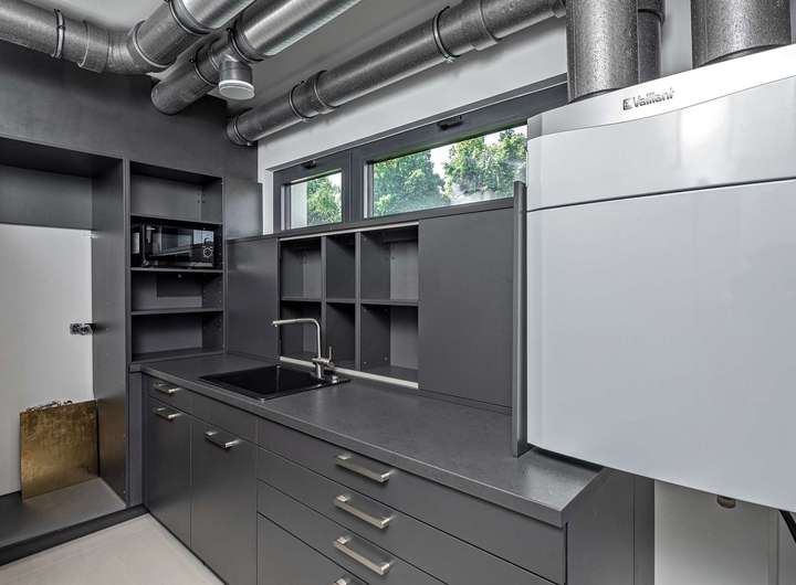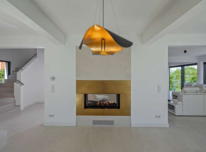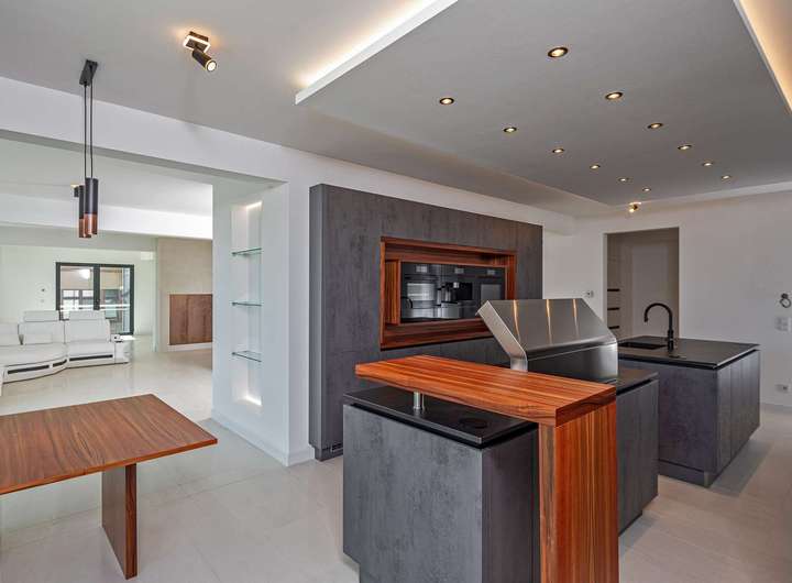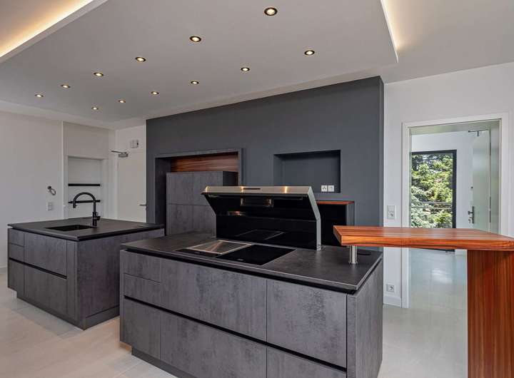 Die hochwertige Einbauküche der Wohnung ist mit allen notwendigen Elektrogeräten und ausreichend Stauraum ausgestattet. Eine Speisekammer an der Küche mit Back-Up Kitchen als Hauswirtschaftsraum sind ebenfalls bereits eingebaut. Besondere Highlights sind der gemütliche Gaskamin (in der Wohnung sowie in den Gewerberäumen) und die indirekte Ambientebeleuchtung, die auf Knopfdruck für eine besondere Atmosphäre sorgen.