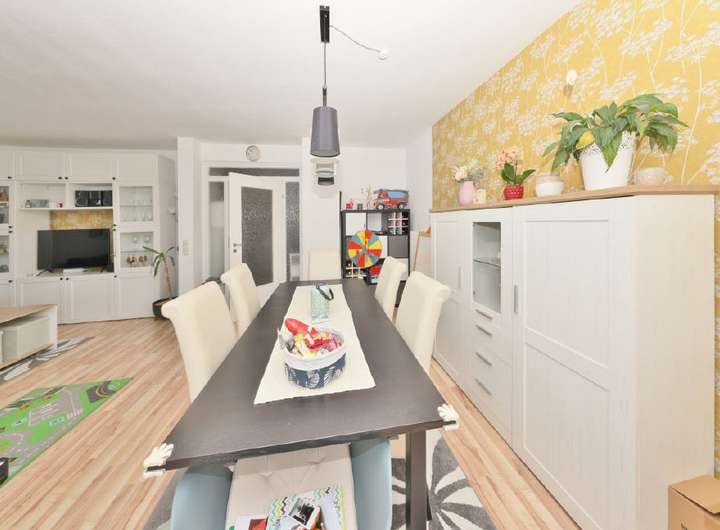 Auf rund 104 m² Wohnfläche verteilt sich ein durchdachter Grundriss mit einem Wohnzimmer, einer Küche, einem Gäste-WC und einem Flur im Erdgeschoss. Vom Wohnzimmer aus gelangt man direkt auf die sonnige Südterrasse und in den liebevoll angelegten Garten - perfekt um den Feierabend im im Grünen zu genießen.