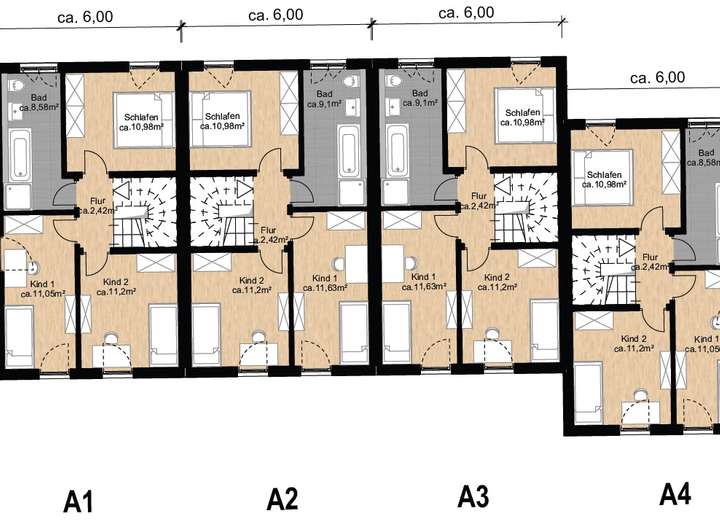 Der Haustyp A3 bietet eine Wohn-/Nutzfläche von ca. 130 m² und einer Grundstücksgröße von ca. 144 m².