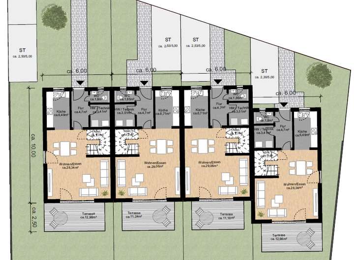 Zudem befindet sich auf dem Grundstück bereits ein Stellplatz (Carport auf Anfrage). Selbstverständlich werden die Reihenhäuser nach den neusten Energiesparkriterien und in massiver Qualitätsbauweise auf realgeteilten Grundstücken errichtet.