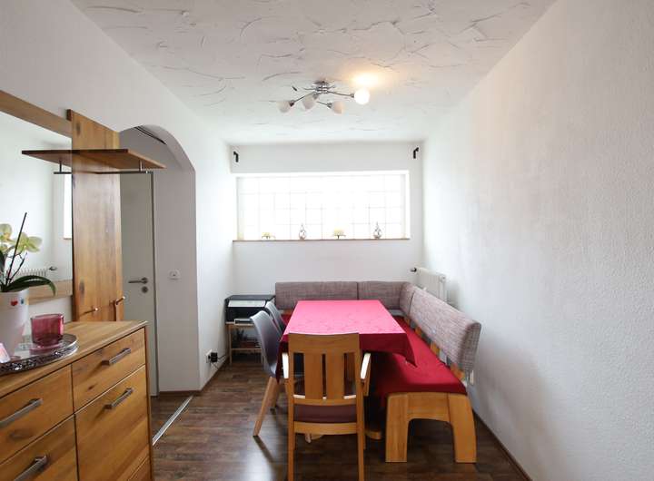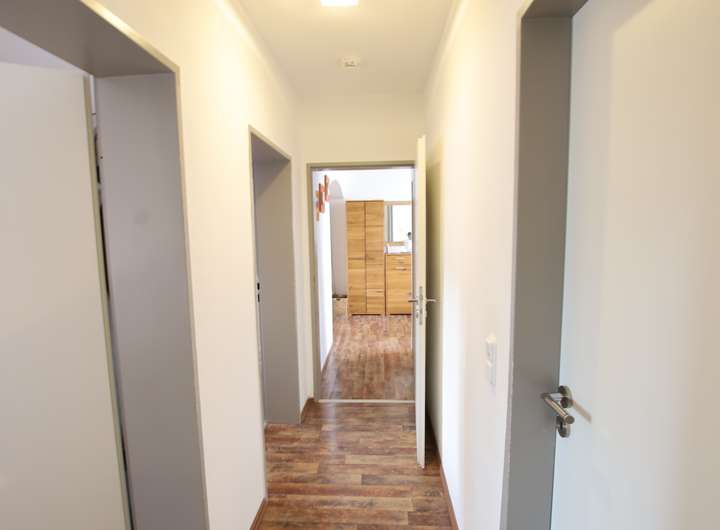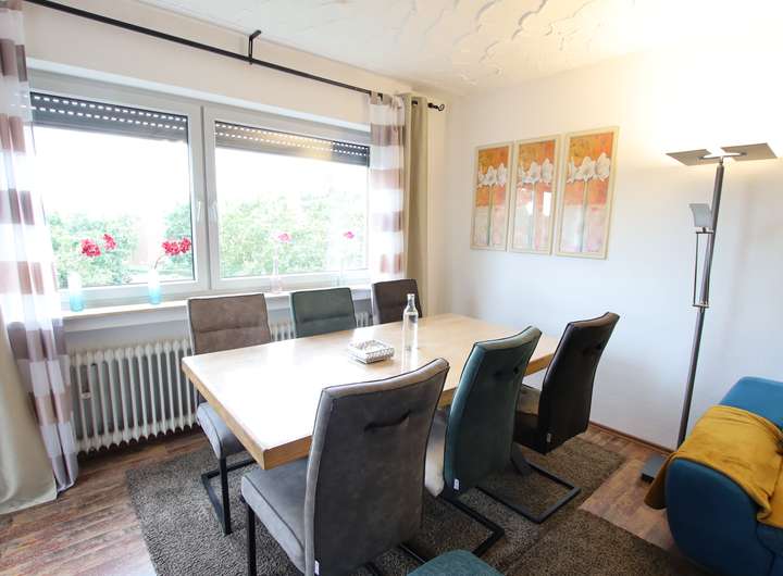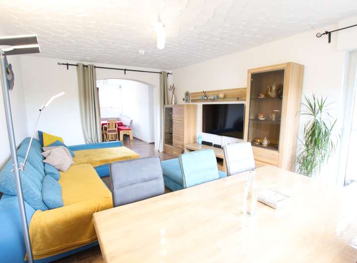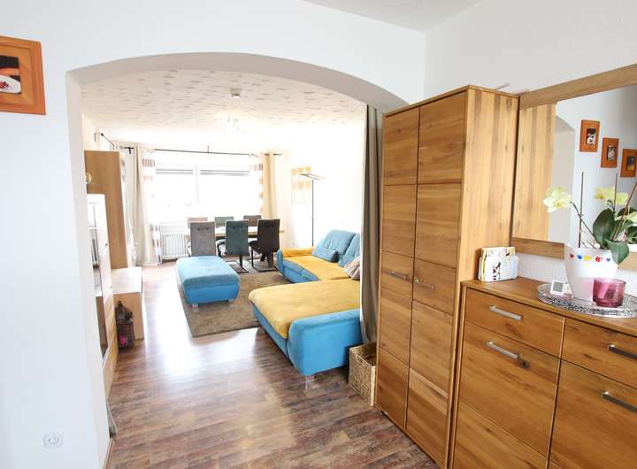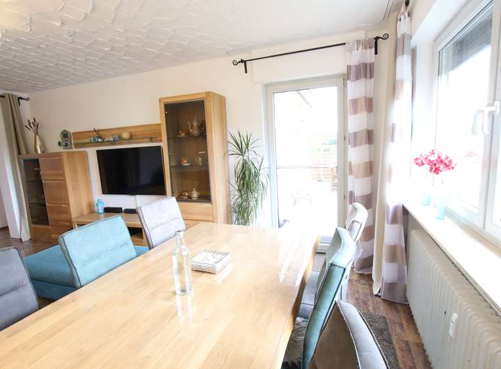 Von der einladenden Diele aus gelangen Sie in jedes Zimmer der Wohnung. Das Herzstück bildet das geräumige Wohnzimmer, welches Ihnen ausreichend Platz für gemütliche Abende mit Familie und Freunden bietet. Durch die großen Fenster genießen Sie hier viel Tageslicht und haben direkten Zugang zum Balkon, der zu entspannten Stunden im Freien einlädt.
