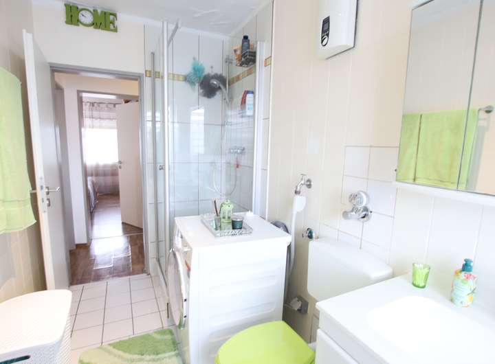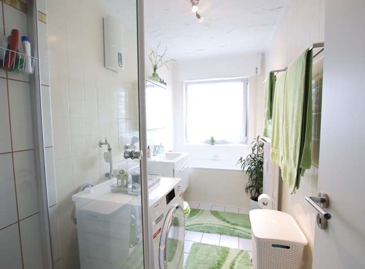 Das moderne Hauptbadezimmer verfügt über eine Badewanne, eine Dusche, einen Waschmaschinenanschluss und ein Fenster, das für natürliche Belüftung und Tageslicht sorgt. Zusätzlich steht Ihnen ein separates Gäste-WC zur Verfügung, was den Komfort dieser Wohnung nochmals unterstreicht.
